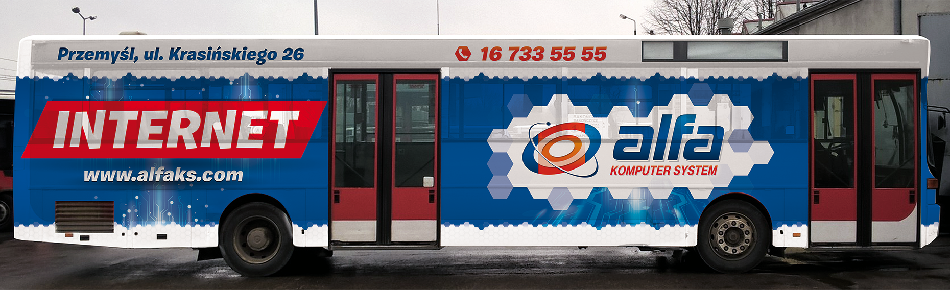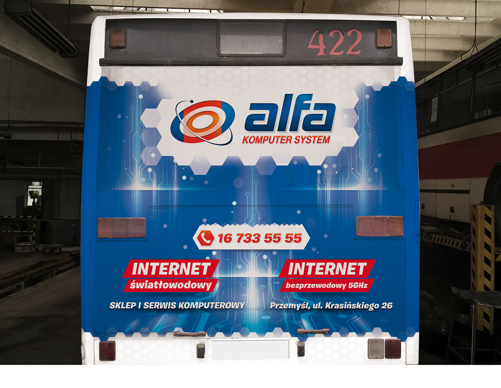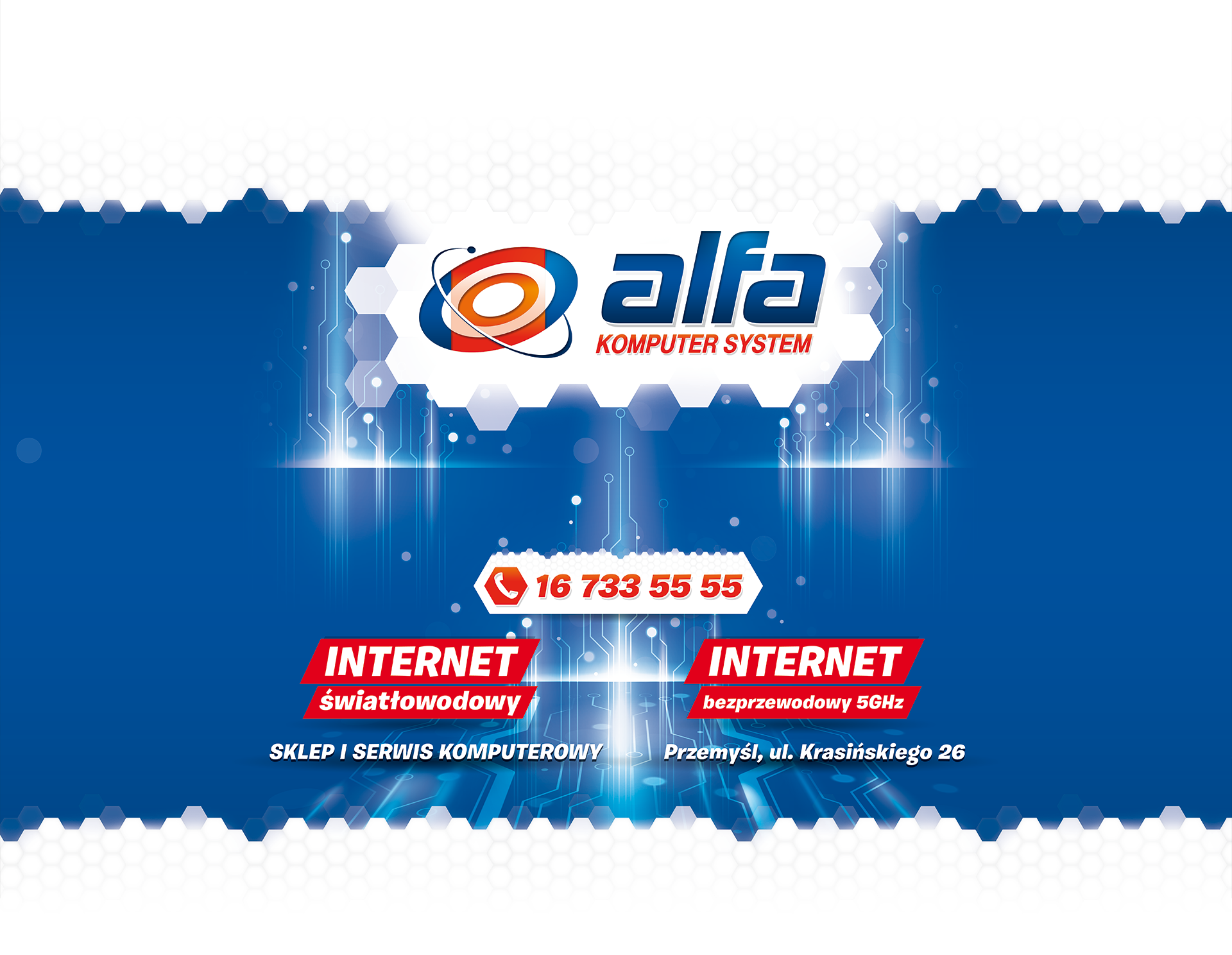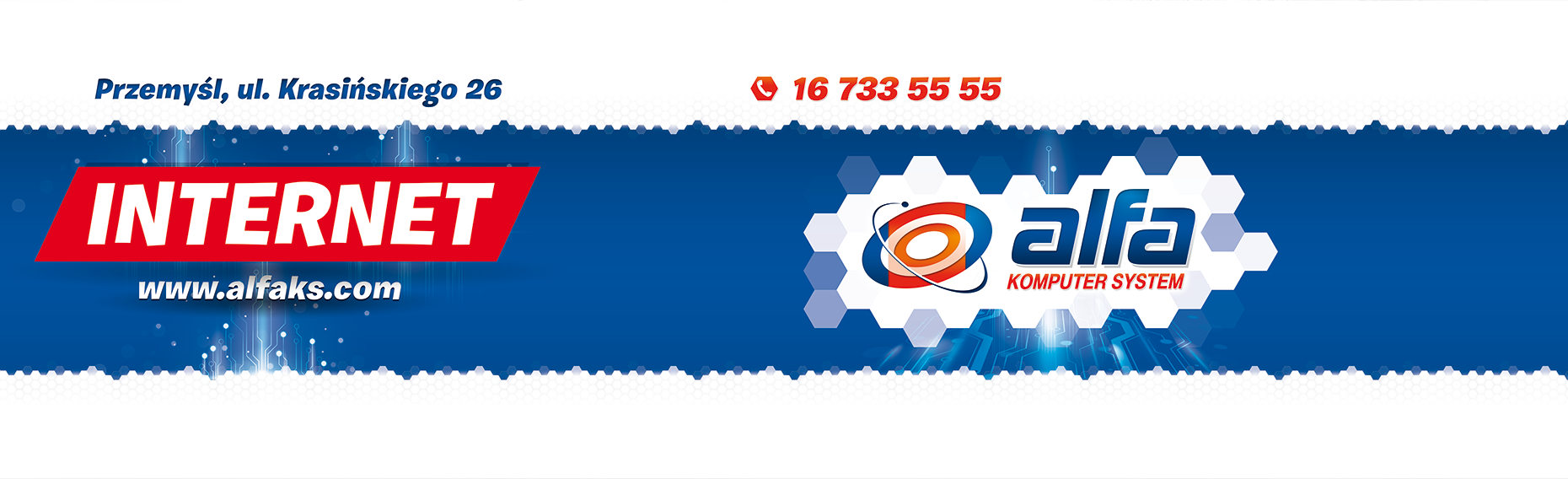 Wykonanie materiałów graficznych na kampanię reklamową dla firmy ALFA Komputer System z Przemyśla. Dostawcy Internetu, salonu i serwisu komputerowego.
