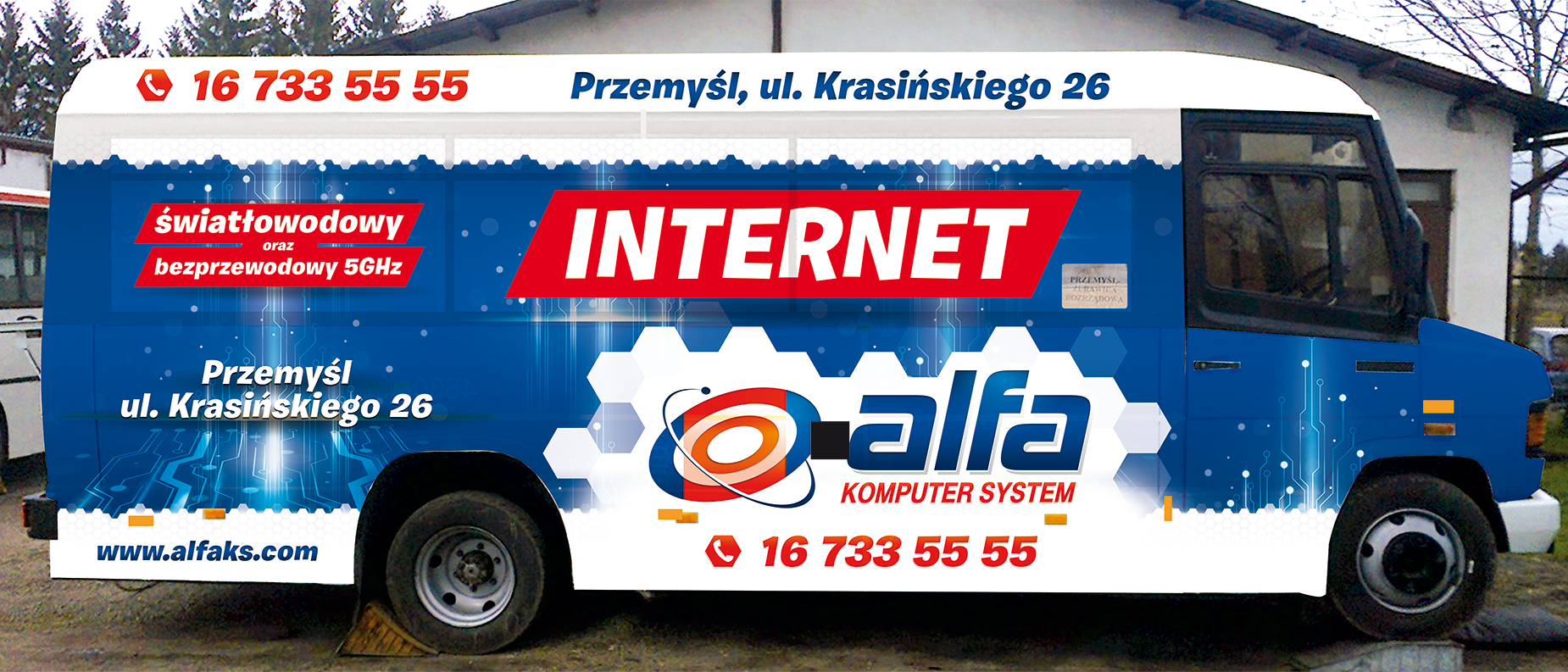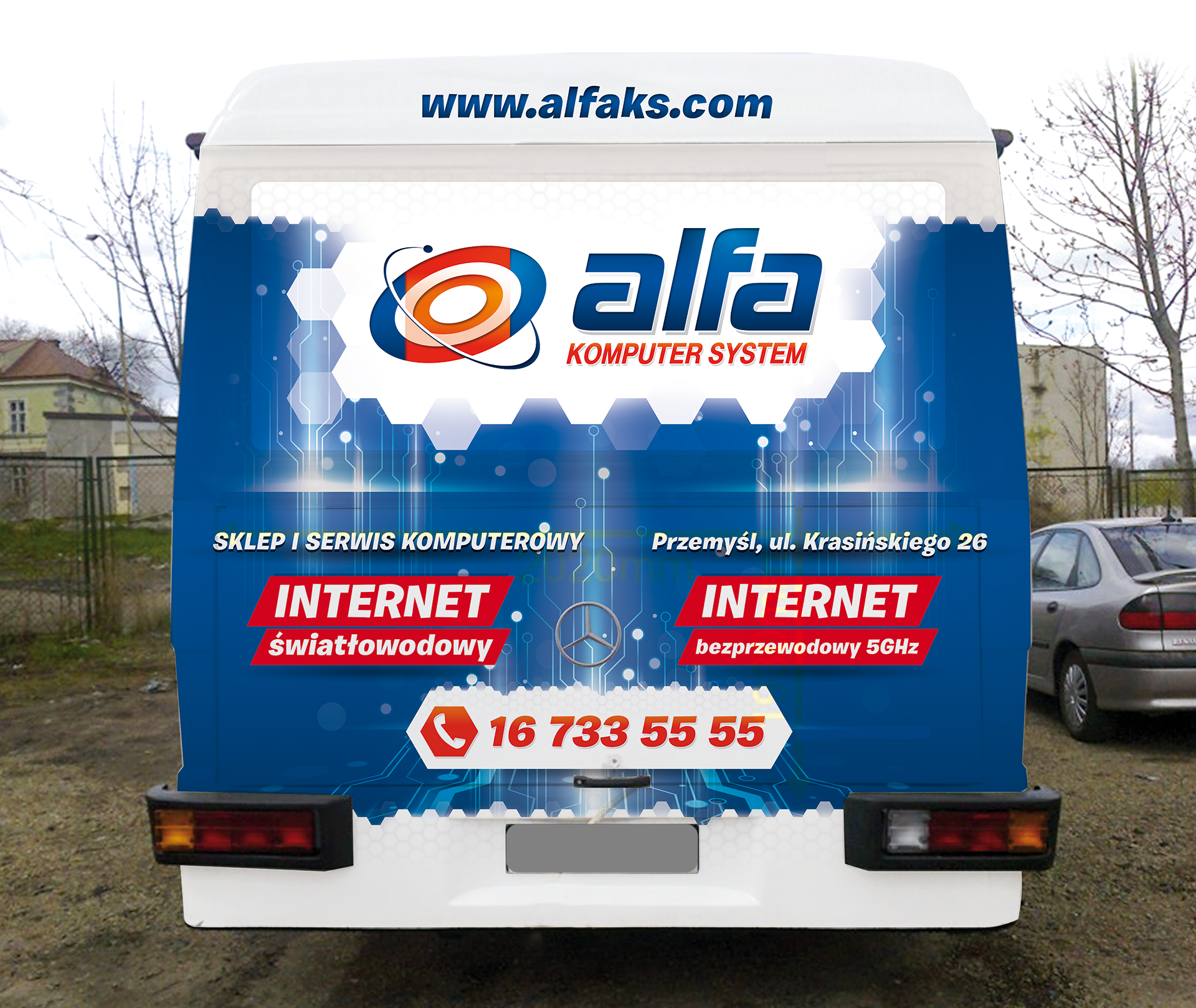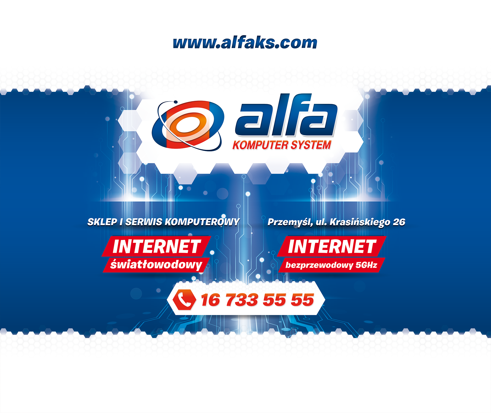 Wykonanie materiałów graficznych na kampanię reklamową dla firmy ALFA Komputer System z Przemyśla. Dostawcy Internetu, salonu i serwisu komputerowego.