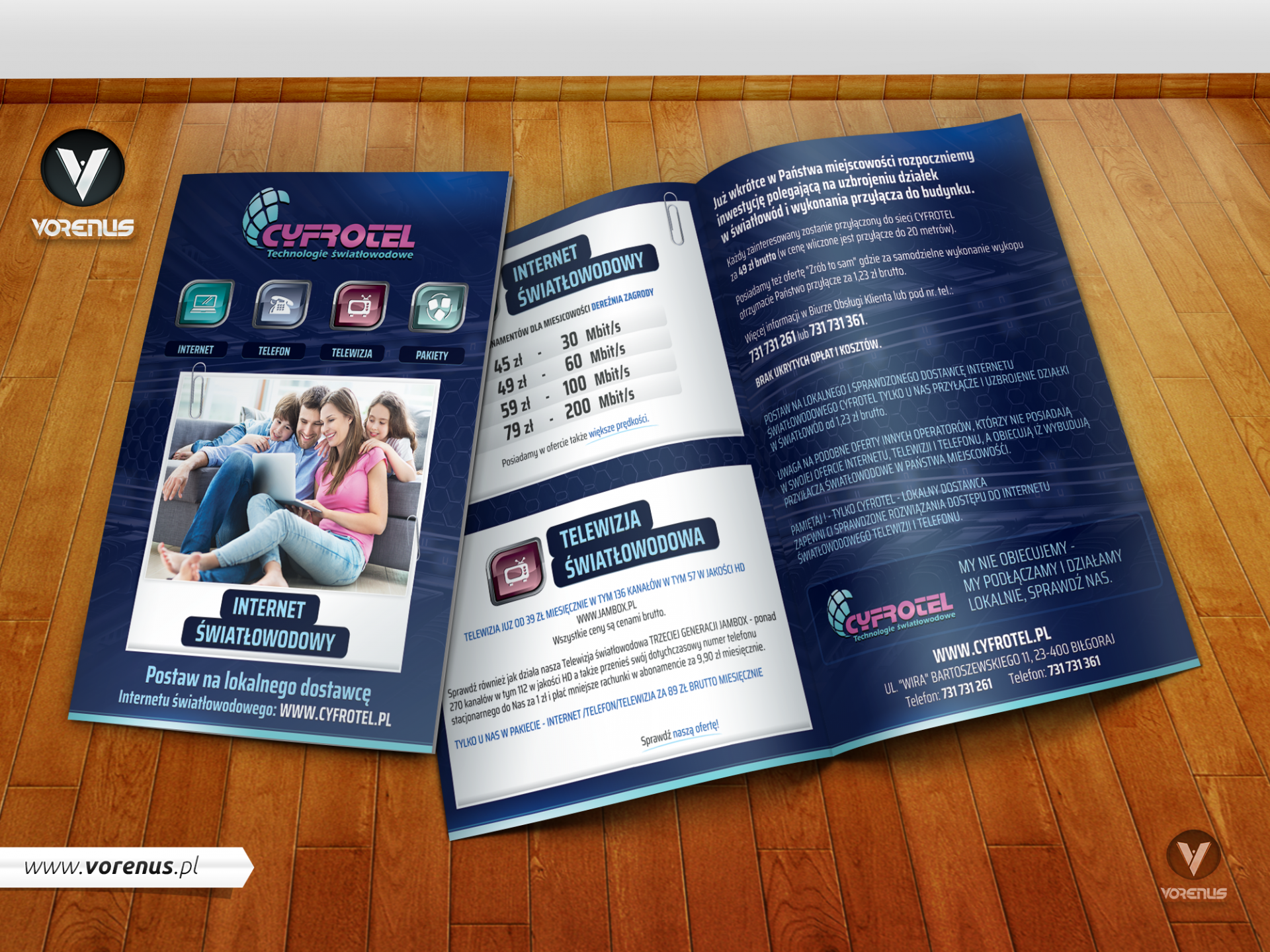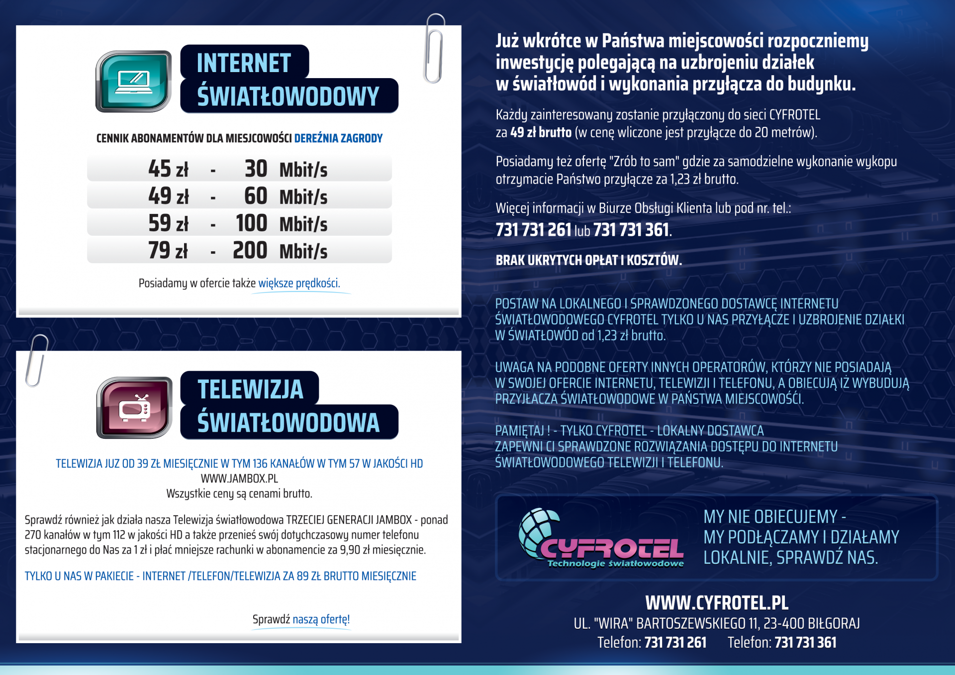 Ulotka prezentuje ofertę firmy, opis świadczonych usług, planowane inwestycje, cennik abonamentów na Internet światłowodowy oraz ofertę na telewizję światłowodową.