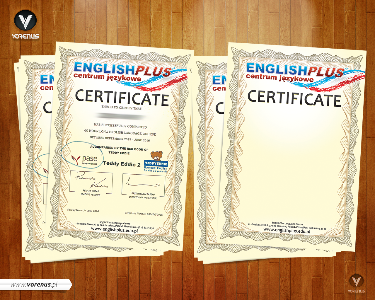Zaświadczenie o przebytych kursach i szkoleniach w Centrum Językowym English PLUS.