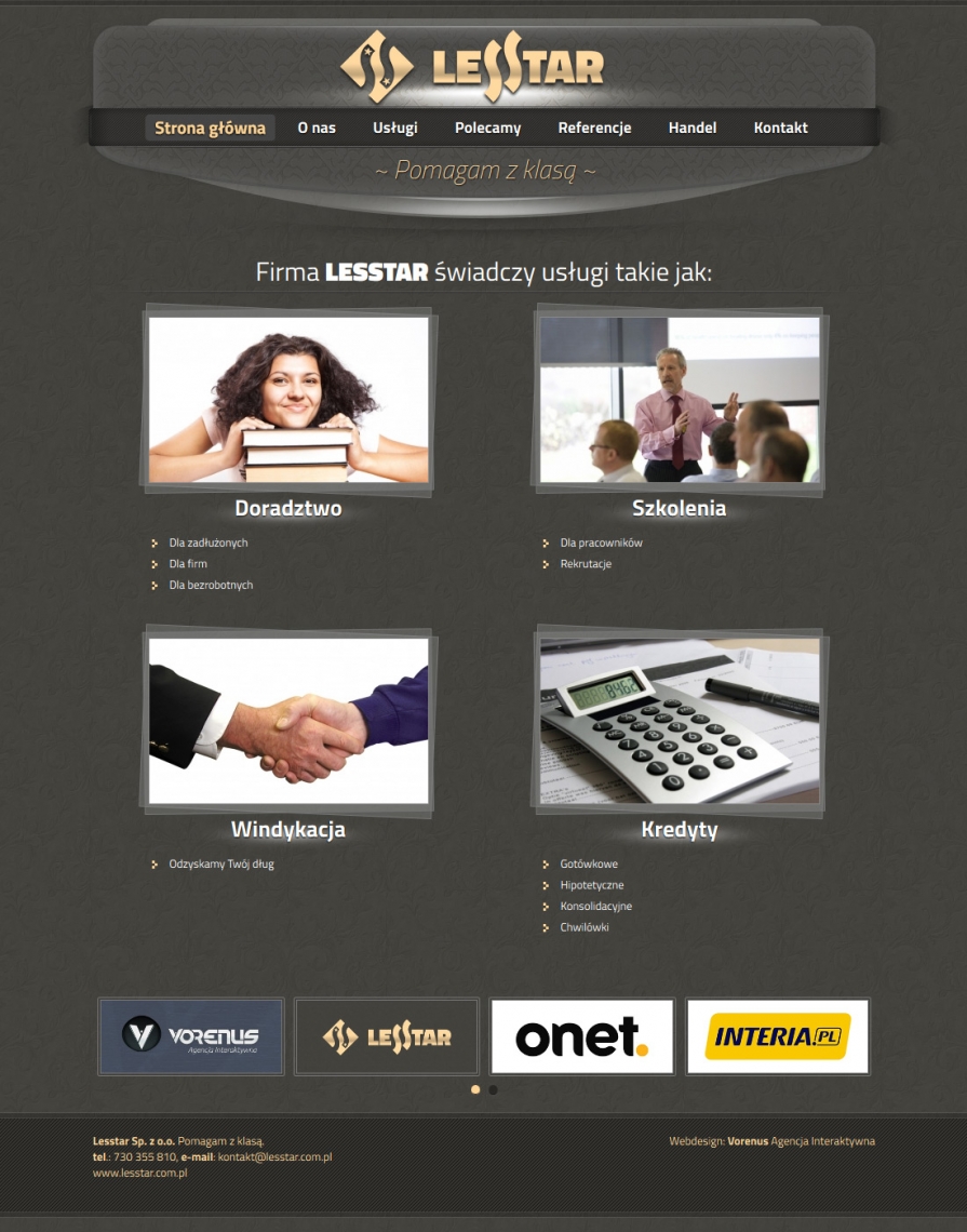Jesteśmy nowoczesną i dynamiczną firmą działającą na polskim rynku usług finansowych,widykacji,doradztwa,rekrutacji i szkoleń. Dysponujemy doświadczoną kadrą specjalistów oraz najnowszymi rozwiązaniami w zakresie teleinformatyki, co zapewnia najwyższą jakość obsługi Klienta. Działamy na rynku już od kilkunastu lat. W tym czasie udało nam się wypracować oraz dostarczyć naszym partnerom formuły kredytowe dostosowane do potrzeb szerokiej grupy Klientów.