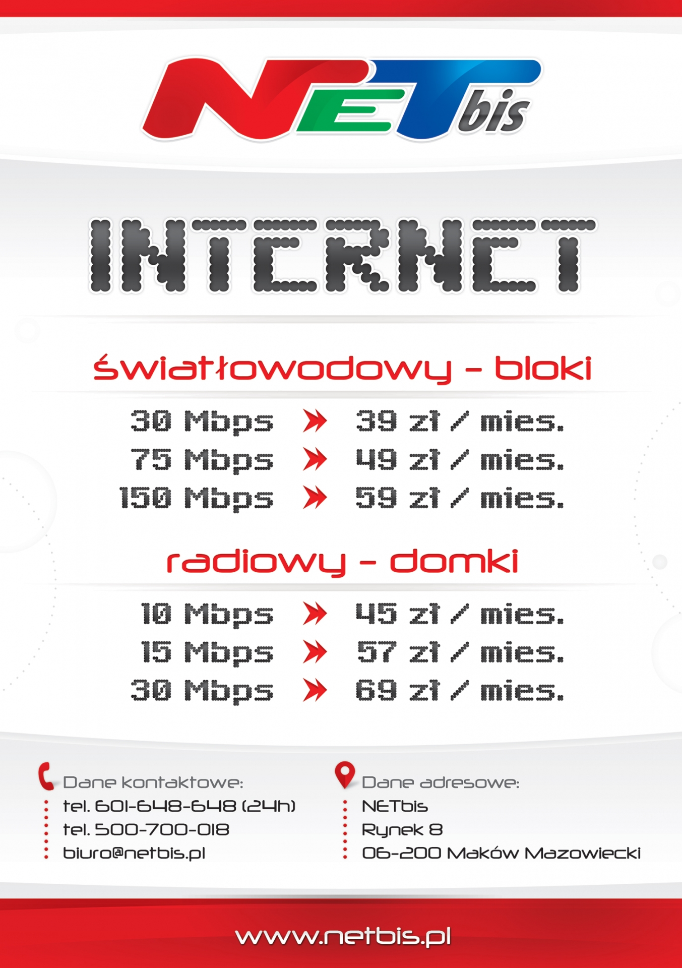 • NETbis - Internet bez limitów. Prezentacja ulotki A5. Dwustronna ulotka dla ISP. Czerwona. Biała. Internetowa. Projektowanie VORENUS.pl