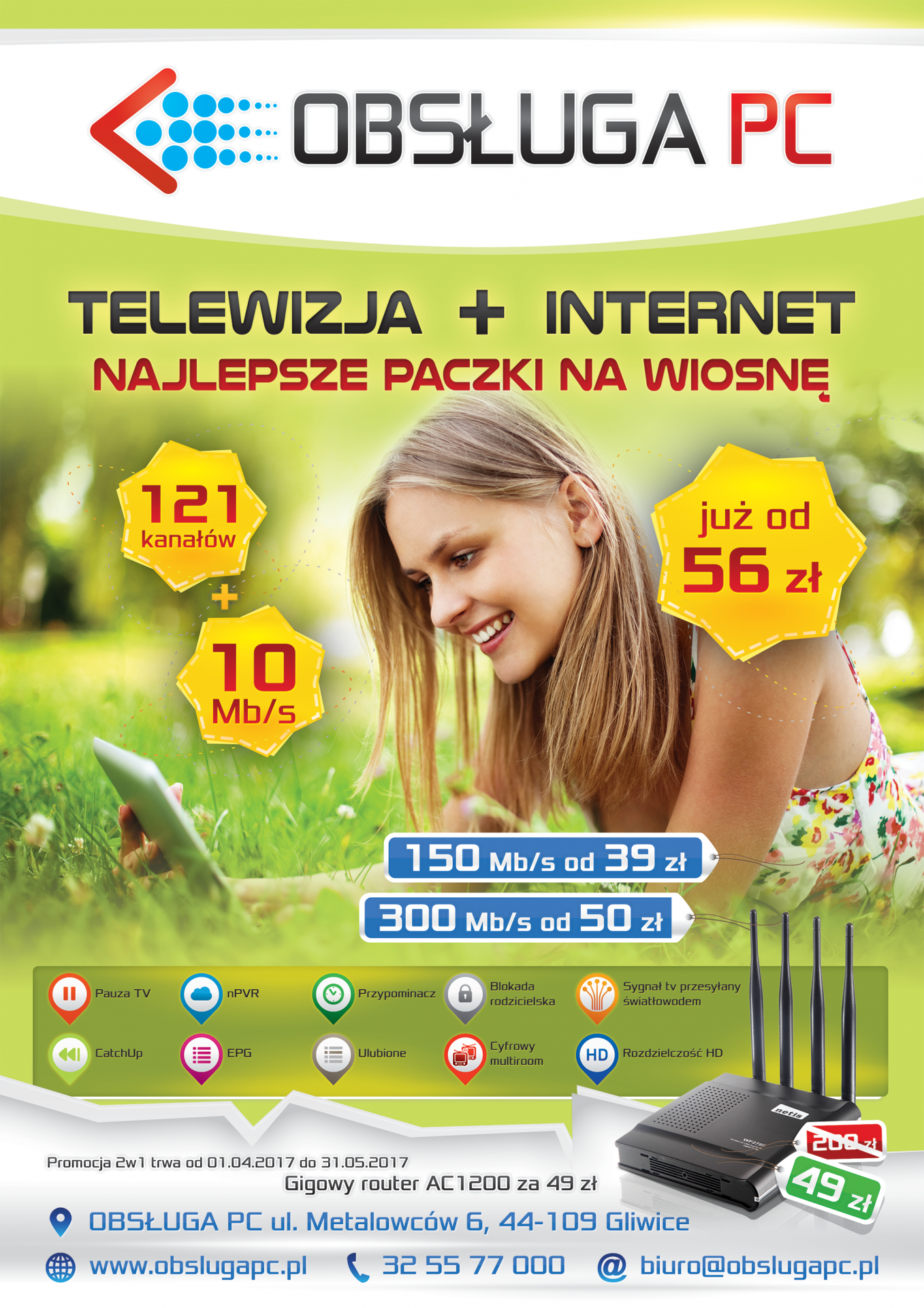 • Obsługa PC. Zawieszki na klamkę. Oferta internet i telewizja. Najlepsze paczki na wiosnę. Reklamy dla dostawców internetu i telewizji. Oferta usług. Przód zawieszki. Wiosenne ceny, wiosenne promocje