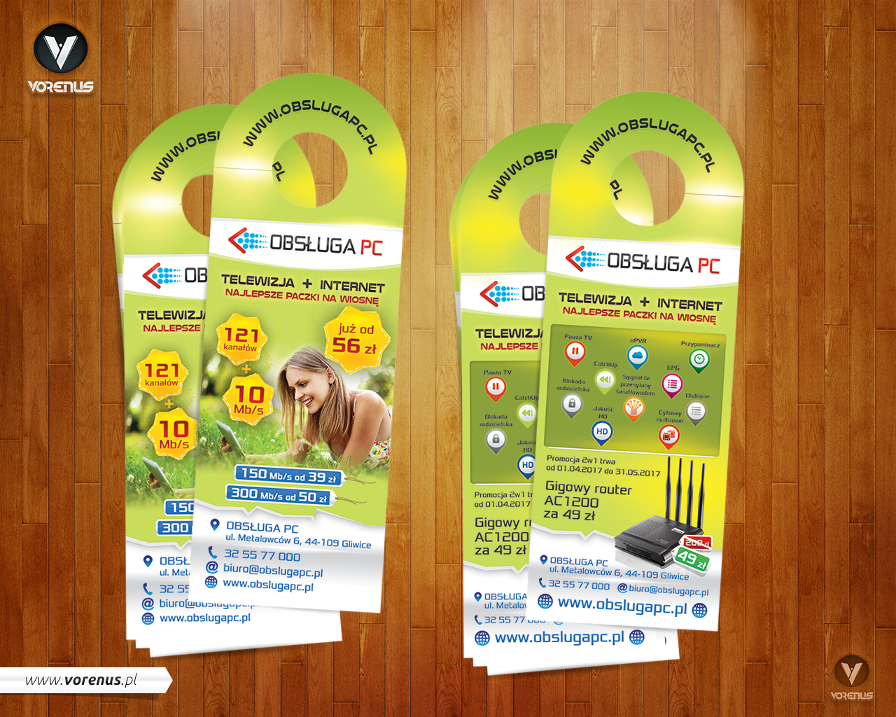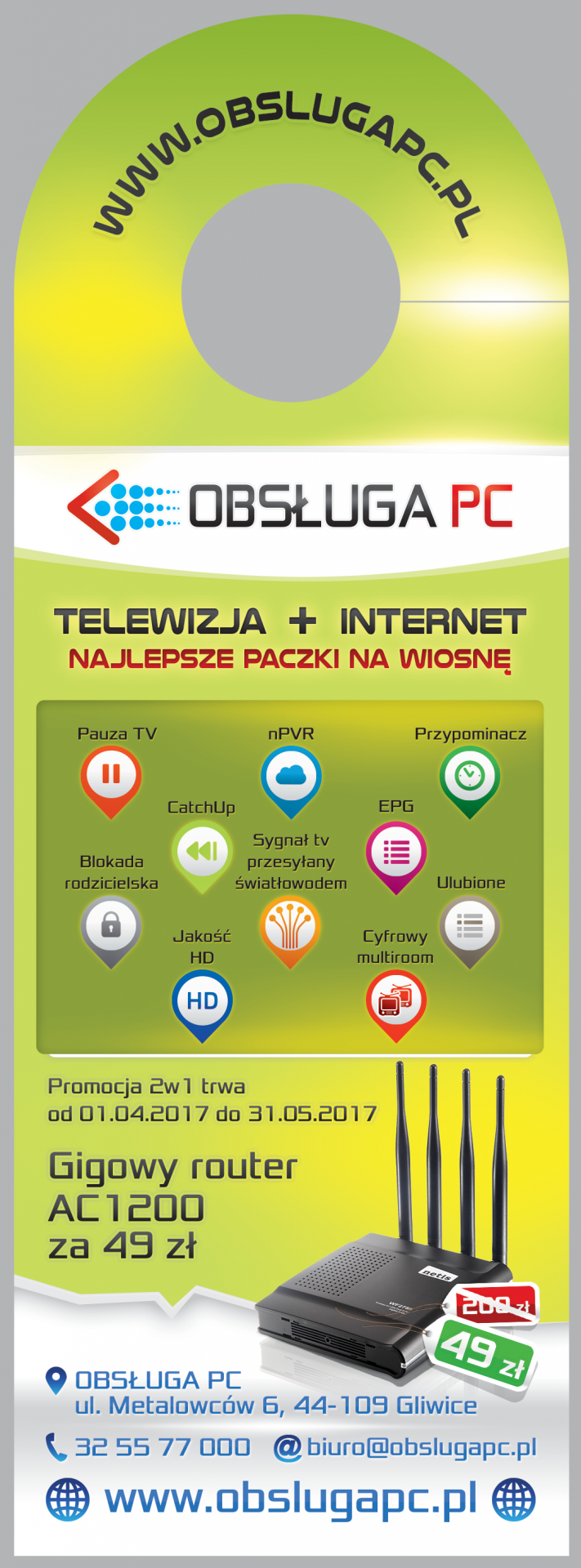 • Obsługa PC. Zawieszki na klamkę. Oferta internet i telewizja. Najlepsze paczki na wiosnę. Reklamy dla dostawców internetu i telewizji. Oferta usług. Tył zawieszki na klamkę. Zielona zawieszka wiosenna.