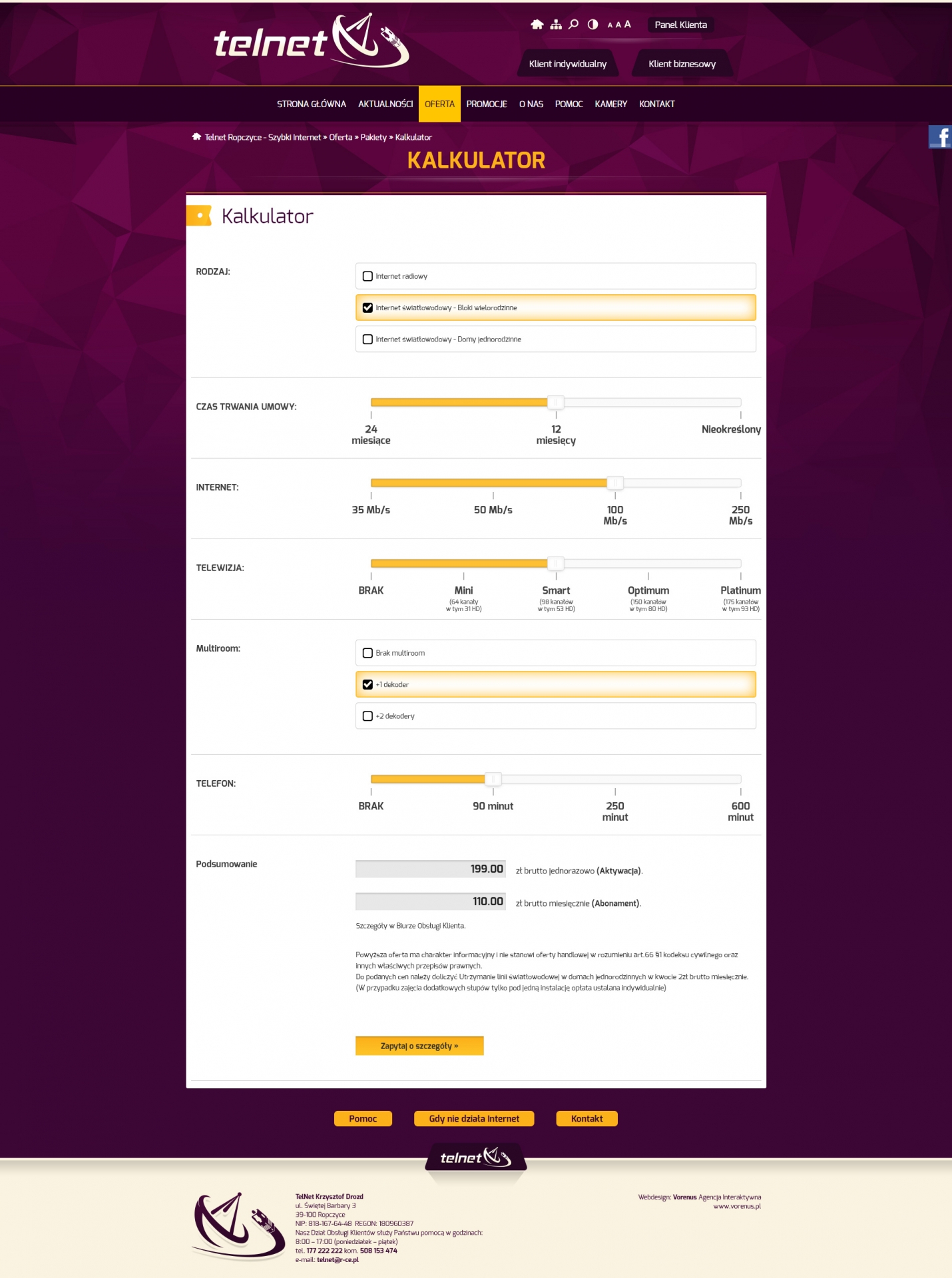Dodatkowo - kalkulator pakietów. Dynamiczne obliczanie cen za pakiet usług w zależności od wybranej konfiguracji. Szybki podgląd kosztów za poszczególny zestaw internetu, telefonu oraz telewizji.