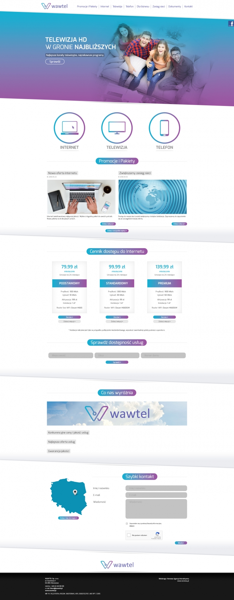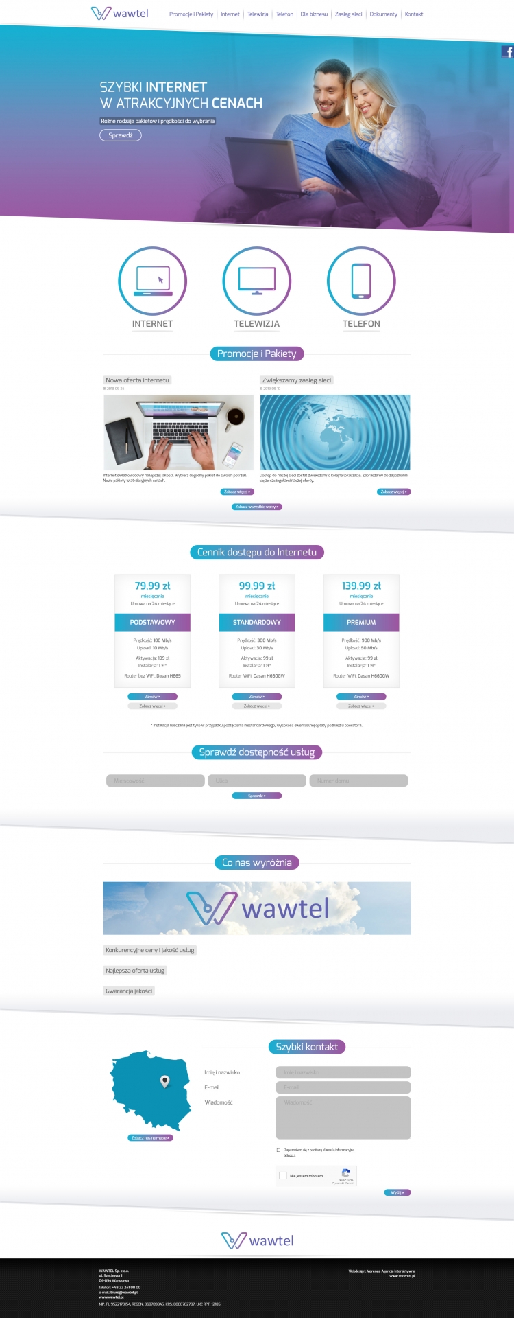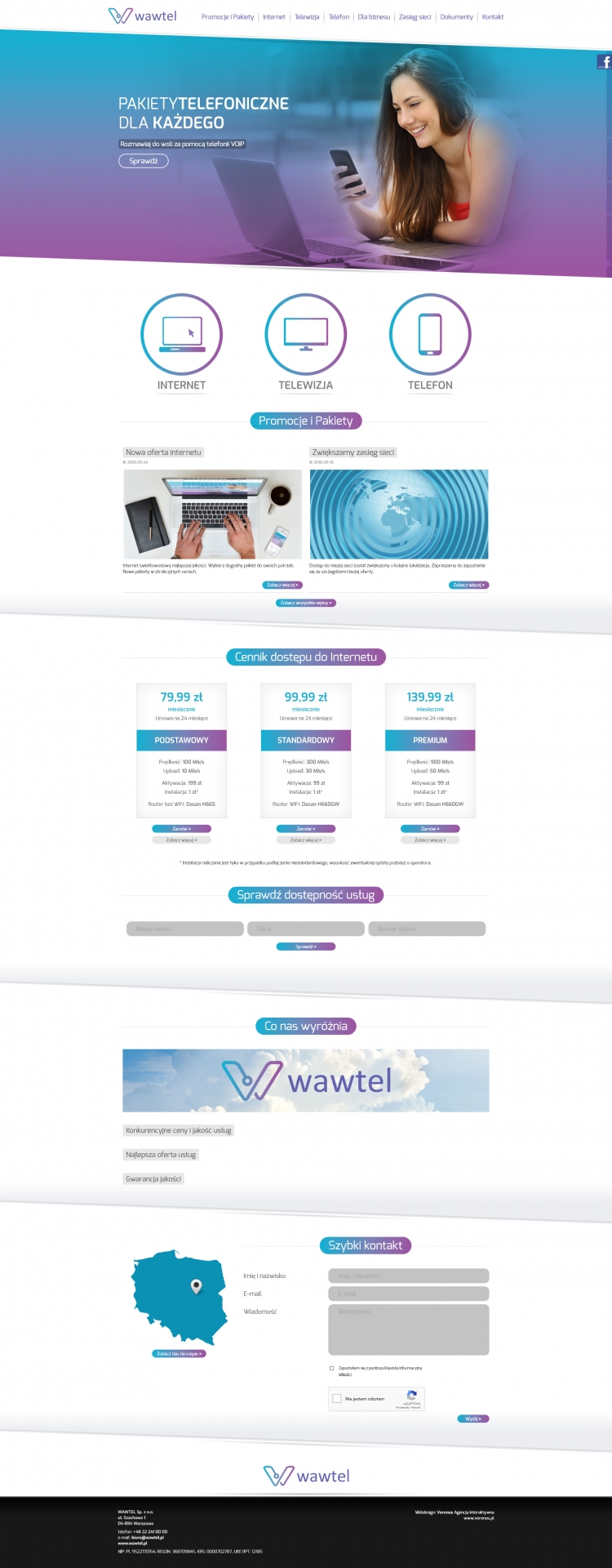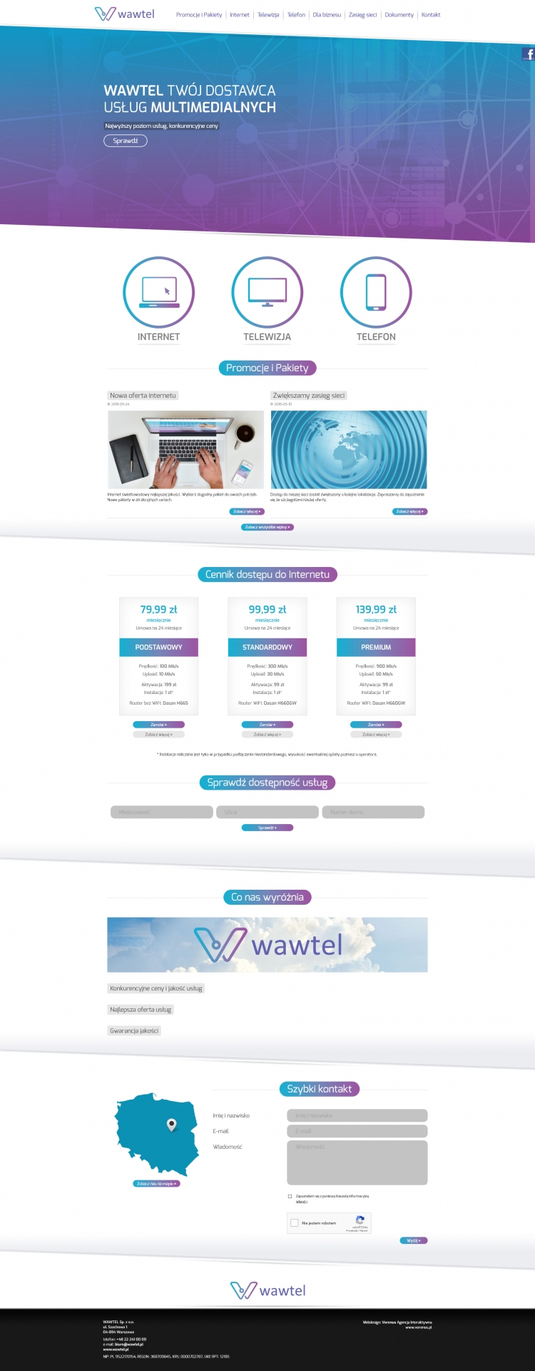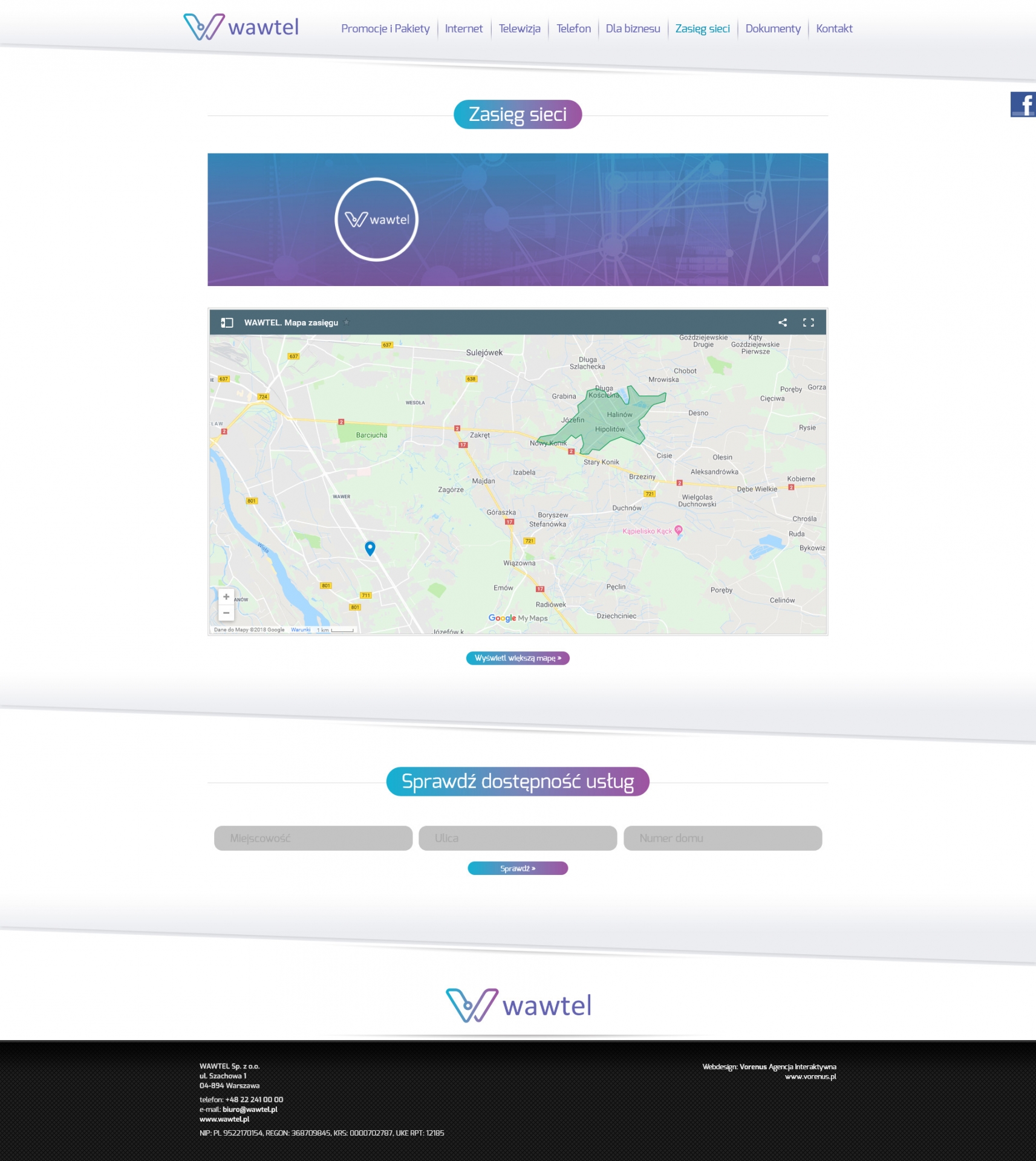 - Strona posiada moduł sprawdzania dostępności usług sieci WAWTEL dla konkretnie podanej lokalizacji: Miejscowość, ulica, numer domu.