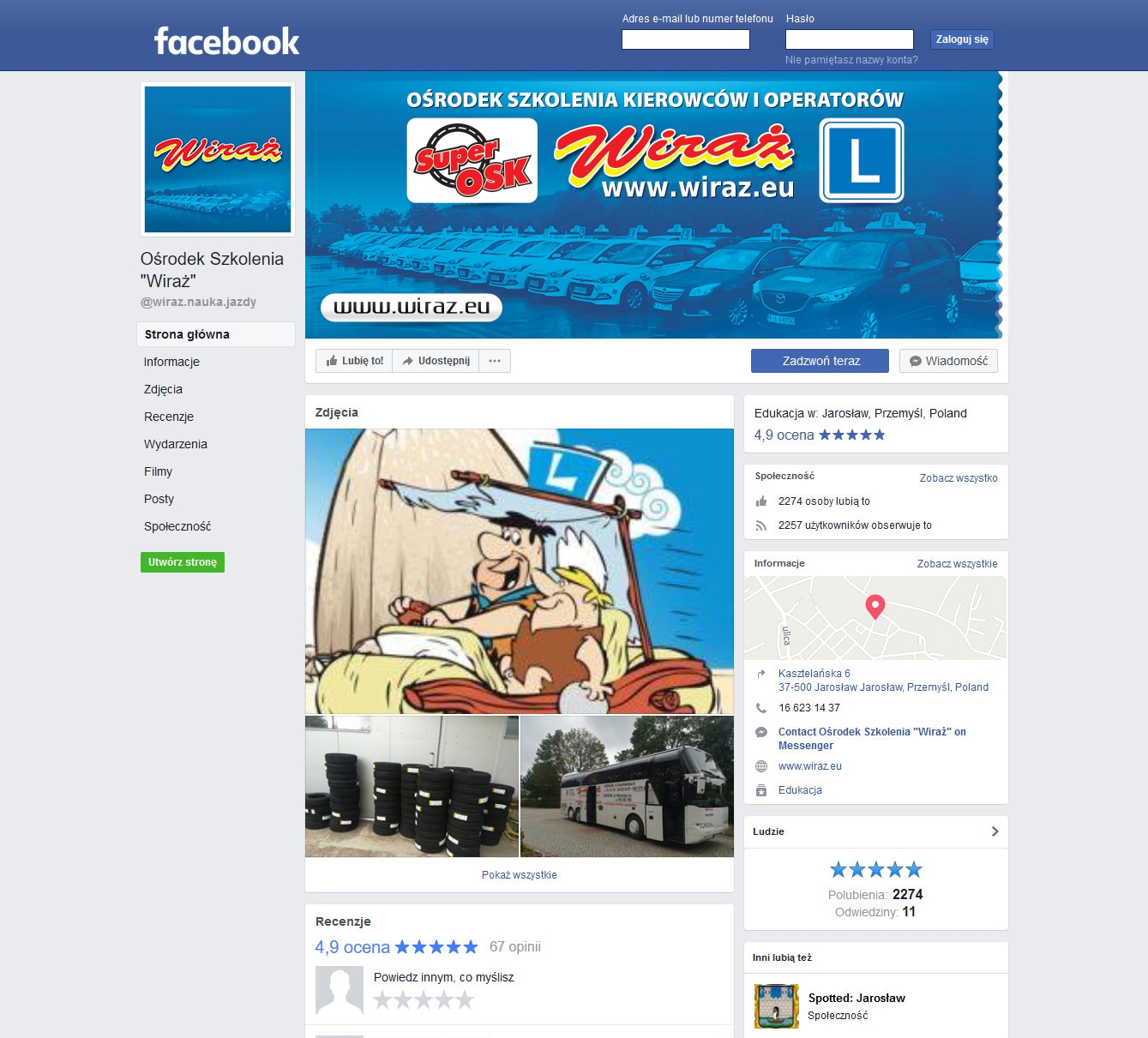 • WIRAŻ - Ośrodek Szkolenia Kierowców. Grafiki reklamowe na Facebook. Podgląd całej strony na Facebook