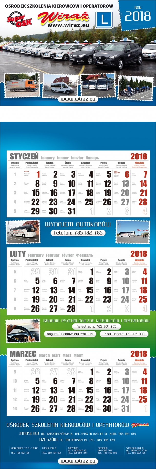 • WIRAŻ - Ośrodek Szkolenia Kierowców. Kalendarz trójdzielny na 2018 rok. Duży format. Szkoła nauki jazdy. Podgląd całego kalendarza.