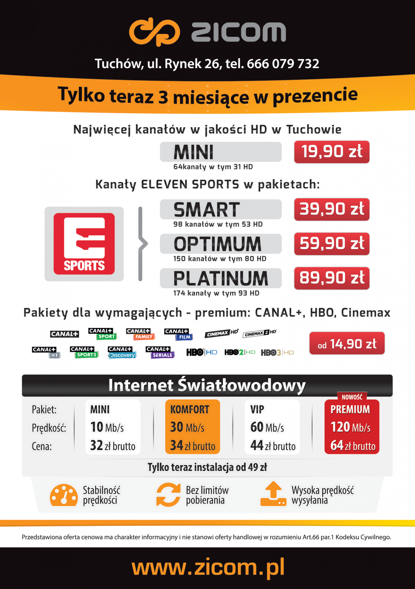 Firma ZICOM oferuje szybki i niezawodny INTERNET, w technologii światłowodowej (FTTH), TELEFON STACJONARNY oraz TELEWIZJĘ.