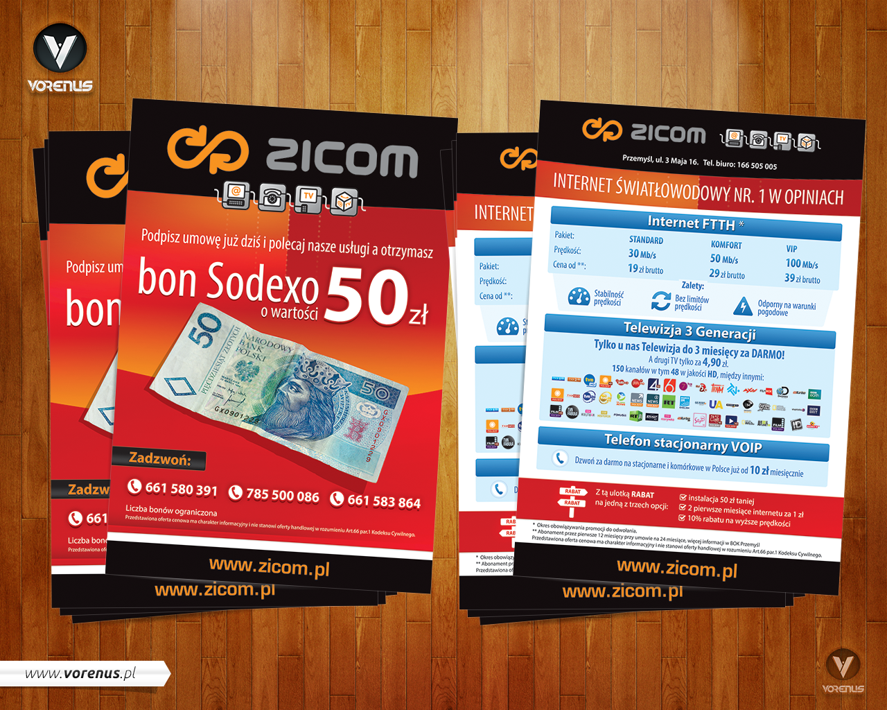 Projekty reklam drukowanych wykonanych dla firmy ZICOM.