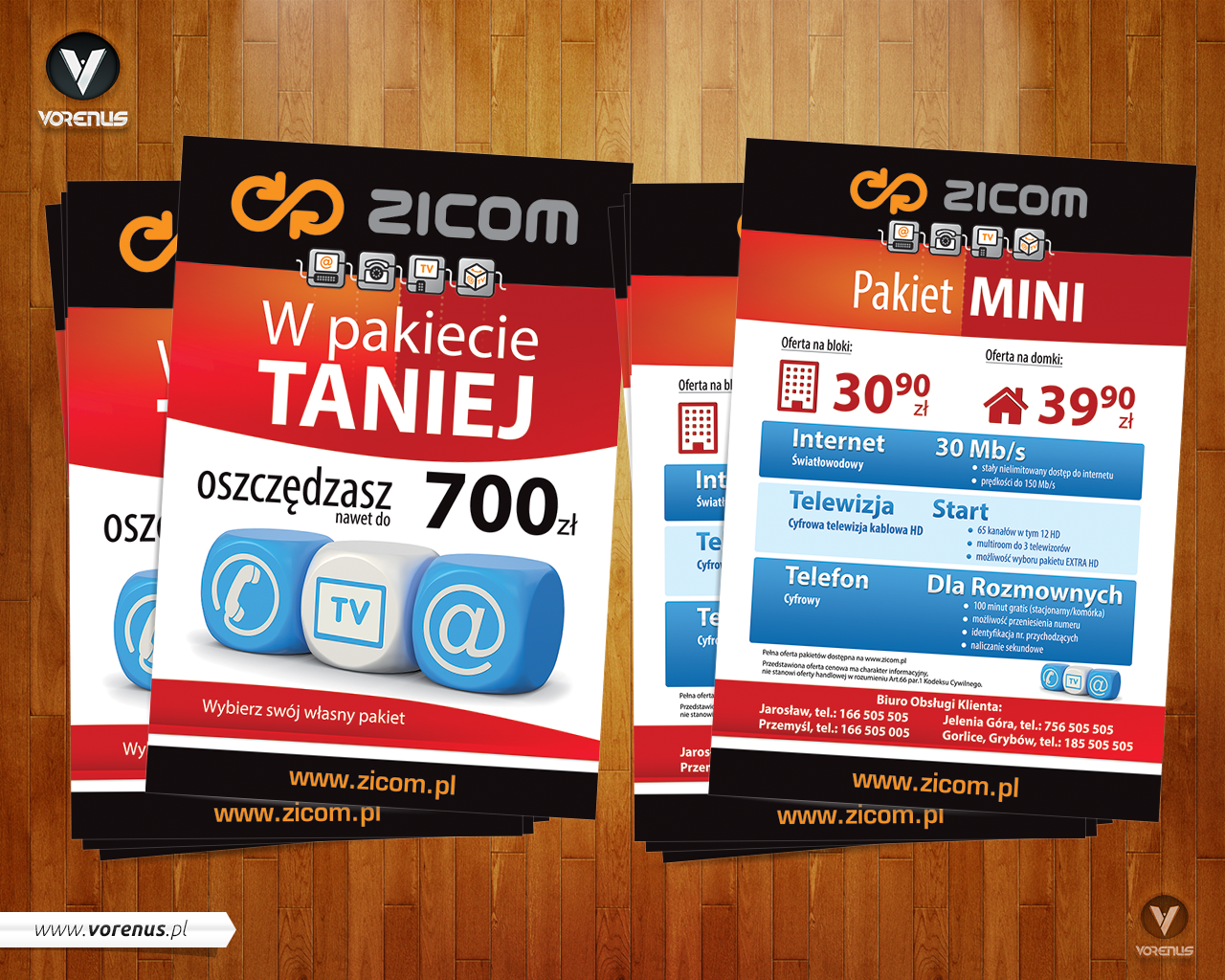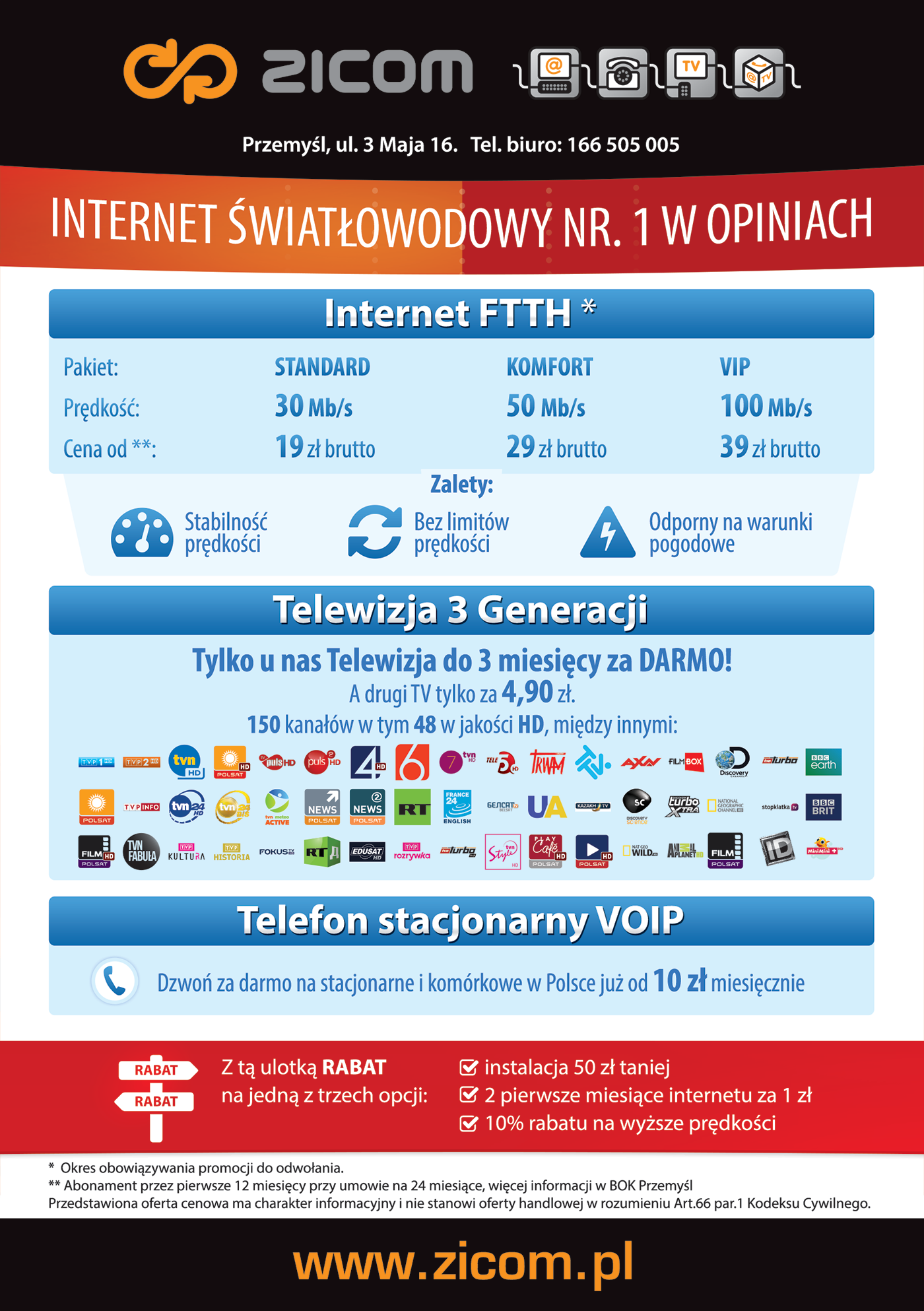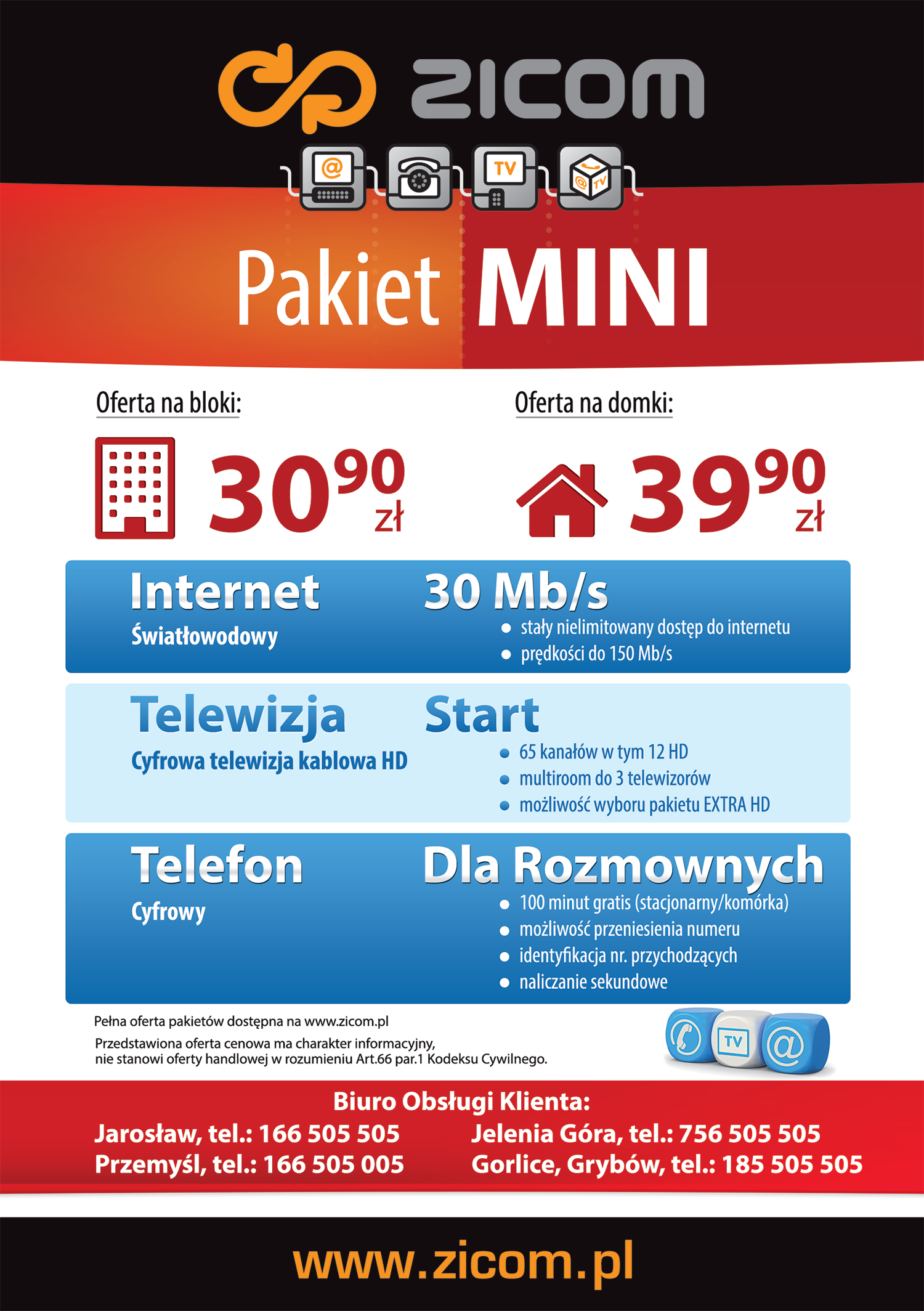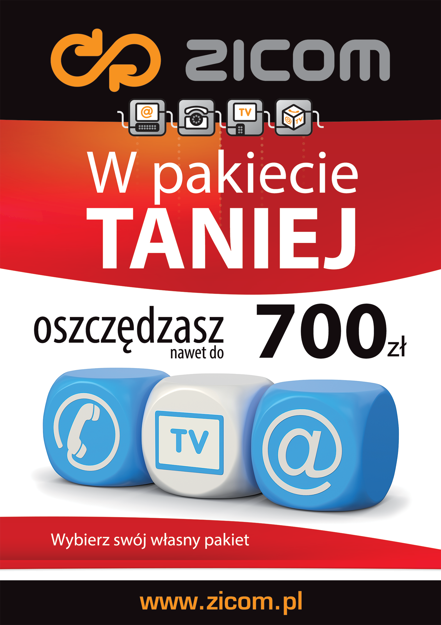 Promocja pakietów usług firmy ZICOM: Internet, Telefon i Telewizja Światłowodowa HD. W pakiecie taniej.